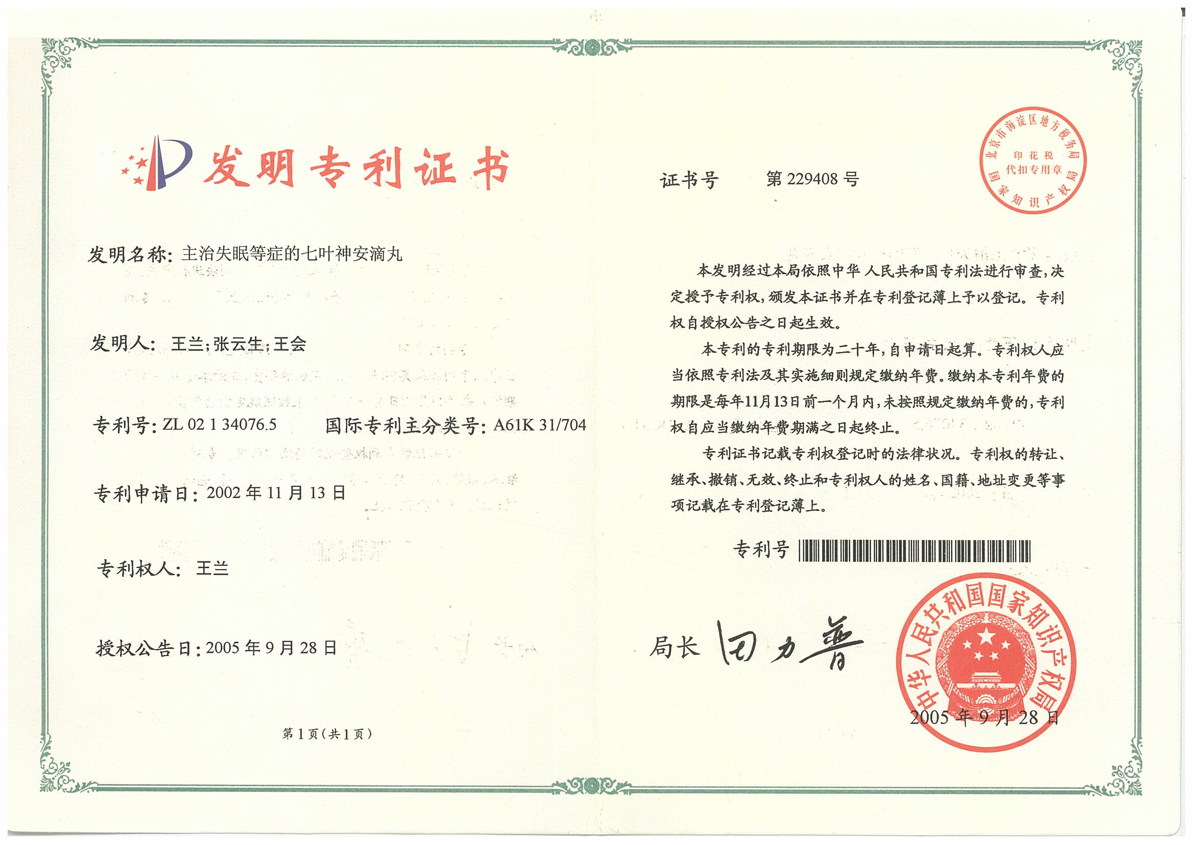 通過多年的努力,公司申報了專利55項、獲得專利授權33項,取得國家新藥證書1個,